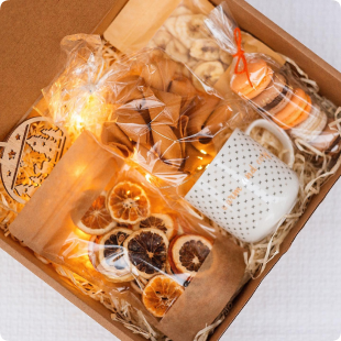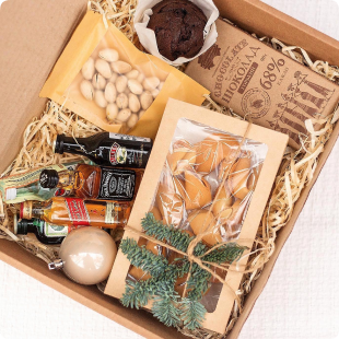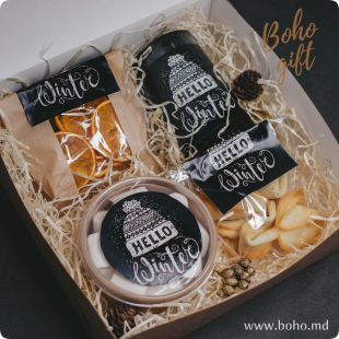 Also, there are 5 fairy-tale cookies with predictions, handmade chocolate, delicious honey, an assortment of tea, and a bottle of fine wine.